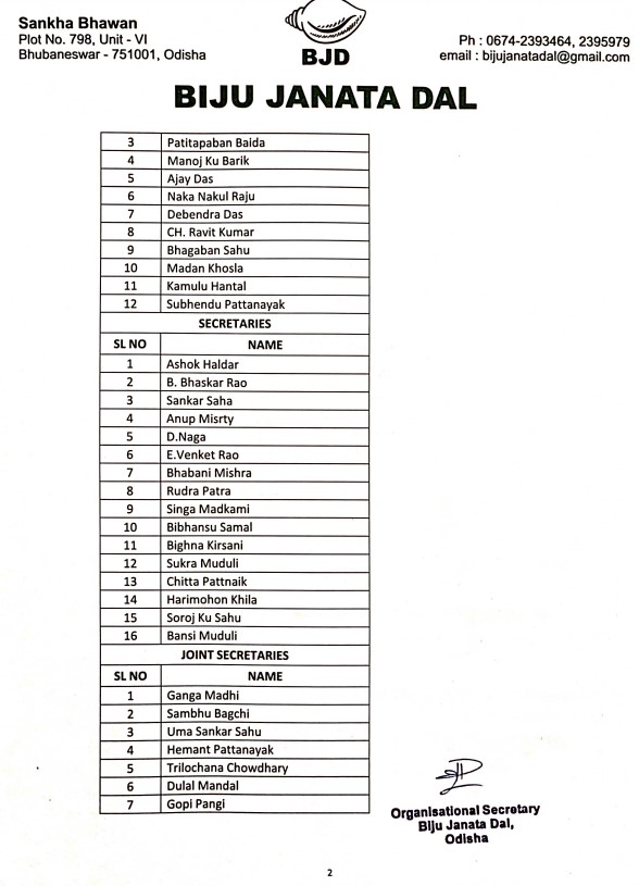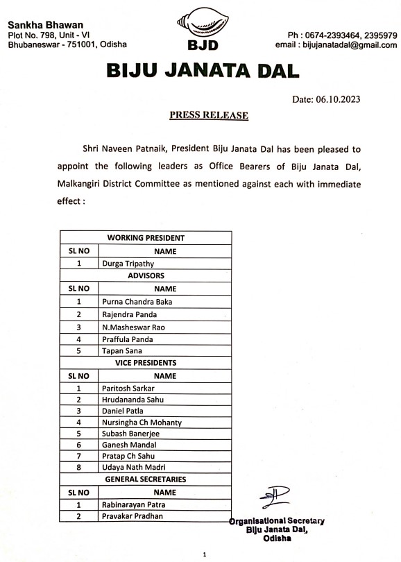 ମାଲକାନଗିରି ଜିଲ୍ଲା ବିଜେଡି ପାଇଁ ନୂତନ କାର୍ଯ୍ୟକର୍ତ୍ତା ଘୋଷଣା, ଦୁର୍ଗା ତ୍ରିପାଠୀଙ୍କୁ କାର୍ଯ୍ୟକାରୀ ସଭାପତି ଦାୟିତ୍ୱ