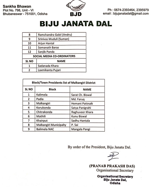 ସେହିପରି କାଲିମେଳା ବ୍ଲକରେ ଶରତ ଚନ୍ଦ୍ର ବିଶ୍ବାଳ, ପଡିଆ ବ୍ଲକରେ ଏମଡି. ଫାରକୁ, ମାଲକାନଗିରି ବ୍ଲକରେ ହେମନ୍ତ ପଟ୍ଟନାୟକ, କୋରୁକୋଣ୍ଡା ବ୍ଲକରେ ସତ୍ୟ ପାଣିଗ୍ରାହୀ, ଚିତ୍ରକୋଣ୍ଡା ବ୍ଲକରେ ରଘୁବୀର ଖରା, ମାଥିଲି ବ୍ଲକରେ କୁନୁ ବିଶ୍ବାଳ, ଖଇରପୁଟ ବ୍ଲକରେ ସାଧୁ ହନ୍ତାଳ, ମାଲକାନଗିରି ପୌରପାଳିକାରେ ପି. ସାଇ ଓ ବାଲିମେଳା ଏନଏସିରେ ମଙ୍ଗଳା ପାଙ୍ଗିଙ୍କୁ ସଭାପତି ଭାବେ ନିଯୁକ୍ତ ହୋଇଥିବା ଦଳର ସାଂଗଠନିକ ସମ୍ପାଦକ ପ୍ରଣବ ପ୍ରକାଶ ଦାସ ପ୍ରେସ ବିବୃତିରେ ଜଣାଇଛନ୍ତି। ଏହାକୁ ନେଇ ଜିଲ୍ଲା ବିଜୁ ଜନତା ଦଳରେ ଖୁସିର ଲହରୀ ଖେଳିଯାଇଛି । ନୂତନ ନେତୃତ୍ୱରେ ଦଳ ଆଗାମୀ ଦିନରେ ଆହୁରି ଅଧିକ ସୁଦୃଢ ହେବ ବୋଲି ଦଳୀୟ କର୍ମୀ ପ୍ରକାଶ କରିଛନ୍ତି ।