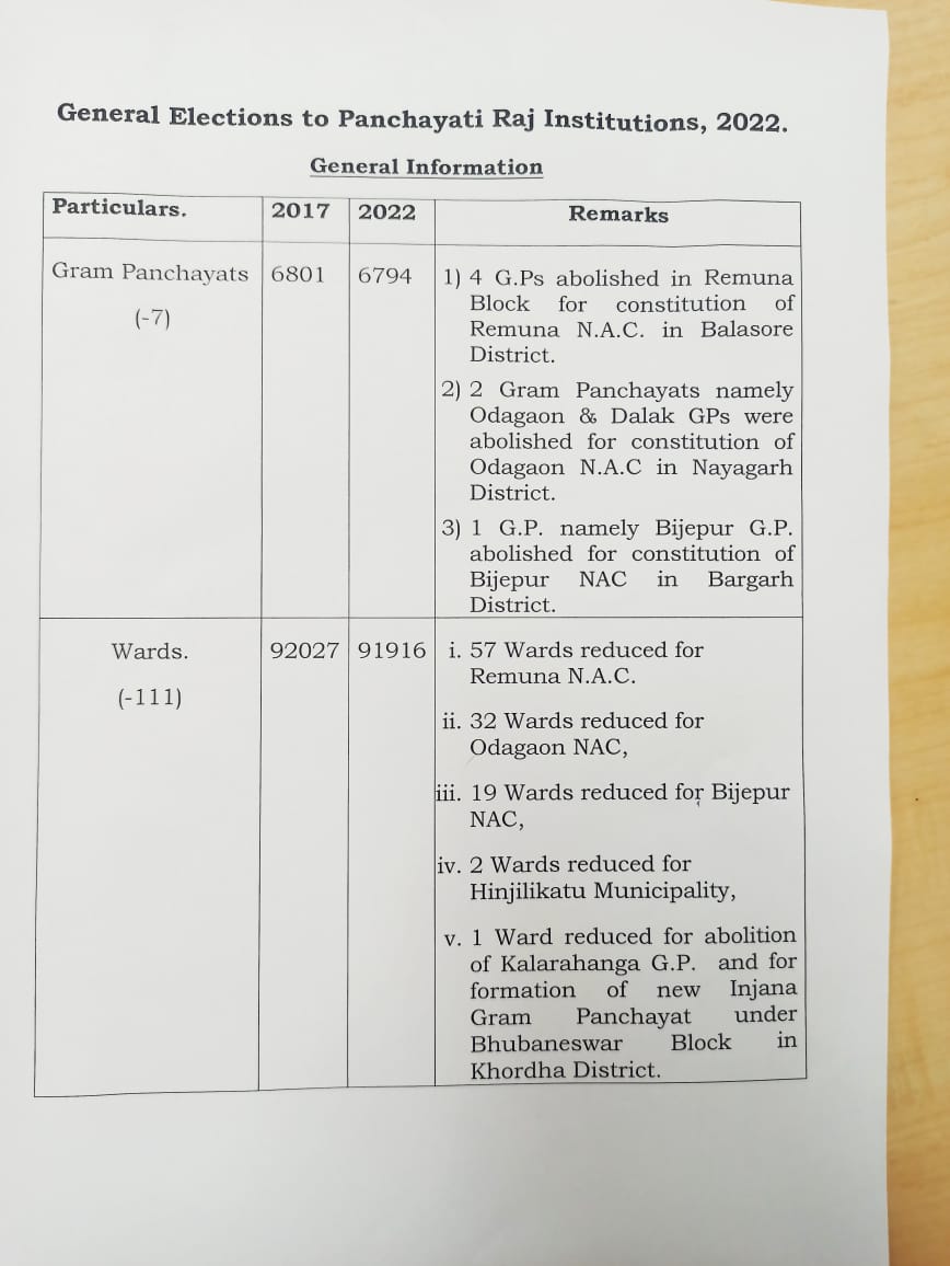 ସେହିପରି ୧୧୧ ଟି ୱାର୍ଡରେ ତ୍ରି ସ୍ତରୀୟ ପଞ୍ଚାୟତ ନିର୍ବାଚନ ହେବ ନାହିଁ । ୯୧୯୧୬ ୱାର୍ଡ ତ୍ରି ସ୍ତରୀୟ ପଂଚାୟତ ନିର୍ବାଚନ ଅନୁଷ୍ଠିତ ହେବ । ଗତ ୨୦୧୭ ରେ ୯୨ ହଜାର ୨୭ ଟି ୱାର୍ଡରେ ନିର୍ବାଚନ ହୋଇଥିଲା । ୧୧୧ ୱାର୍ଡ ଏନଏସସିରେ ମିଶିଥିବାରୁ ଏଠାରେ ପଞ୍ଚାୟତ ନିର୍ବାଚନ ହେବ ନାହିଁ ।