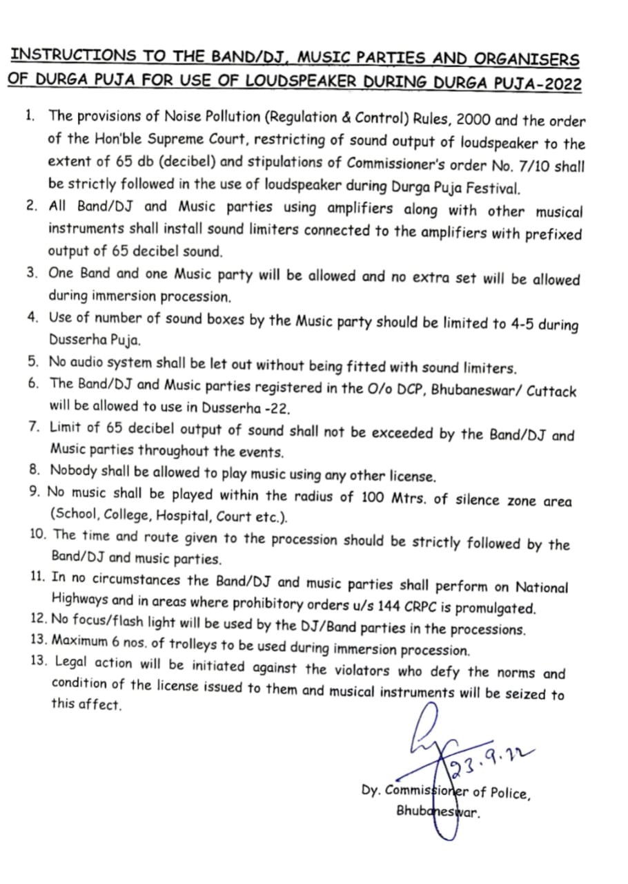 ଦୁର୍ଗାପୂଜା ସମୟରେ ବ୍ୟାଣ୍ଡ-ଡିଜେ ଓ ମ୍ୟୁଜିକ ପାର୍ଟି ଉପରେ ପୁଲିସ କଟକଣା, ୬୫ ଡେସିବିଲ ଭିତରେ ରହିବ ଲାଉଡ ସ୍ପିକର ସାଉଣ୍ଡ