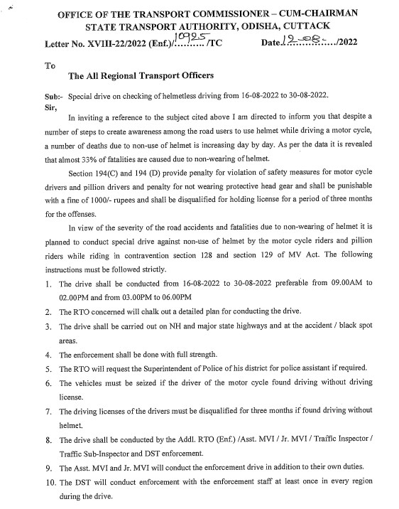 ଏକ ସର୍ଭେରୁ ଜଣାପଡ଼ିଛି ଯେ ୩୩ ପ୍ରତିଶତ ବାଇକ ଚାଳକଙ୍କ ମୃତ୍ୟୁ କେବଳ ବିନା ହେଲମେଟ୍ ଯୋଗୁ ହିଁ ହୋଇଛି। ଦିନକୁ ଦିନ ବାଇକ୍ ଚାଳକଙ୍କ ଦୁର୍ଘଟଣା ଜନିତ ମୃତ୍ୟୁ ବଢ଼ିବାରେ ଲାଗିଥିବାରୁ ଏହା ରାଜ୍ୟ ପାଇଁ ଏକ ଉଦବେଗଜନ ପ୍ରସଂଗ ହୋଇଛି। ଏଣୁ ଆସନ୍ତା ଅଗଷ୍ଟ ୧୬ ତାରିଖରୁ ୩୦ ତାରିଖ ପର୍ୟ୍ୟନ୍ତ ରାଜ୍ୟରେ ହେଲମେଟ୍ ଚେକିଂ କଡ଼ାକଡ଼ି କରାଯିବାକୁ ପରିବହନ କମିସନର ରାଜ୍ୟର ସମସ୍ତ ଆରଟିଓଙ୍କୁ ନିର୍ଦ୍ଦେଶ ଦେଇଛନ୍ତି। ଏହି ଚଢ଼ଉ ସକାଳ ୯ଟାରୁ ଦିନ ୨ଟା ଏବଂ ଅପରାହ୍ନ ୩ଟାରୁ ସନ୍ଧ୍ୟା ୬ଟା ପର୍ଯ୍ୟନ୍ତ ଜାରି ରହିବ। ଏହି ଚଢ଼ଉ ଜାତୀୟ ରାଜପଥ, ରାଜ୍ୟ ରାଜପଥ, ବ୍ଲାକ୍ ସ୍ପଟ୍ ଚିହ୍ନଟ ହୋଇଥିବା ସ୍ଥାନ ମାନଙ୍କରେ କରାଯିବ। ଯଦି ଆବଶ୍ୟକ ପଡ଼େ ତେବେ ଆରଟିଓ ପୁଲିସ ସହାୟତା ପାଇଁ ଜିଲ୍ଲା ସ୍ତରରେ ଏସପିଙ୍କୁ ଏ ସଂକ୍ରାନ୍ତରେ ଅବଗତ କରିବେ।