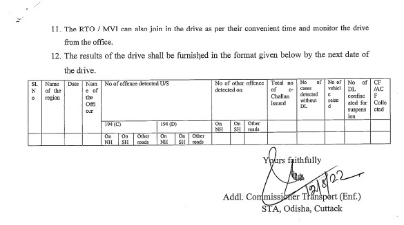 ଏହି ଚଢ଼ଉ କାର୍ଯ୍ୟକ୍ରମରେ ଅତିରିକ୍ତ ଆରଟିଓ(ଏନଫୋର୍ସମେଣ୍ଟ)/ଅତିରିକ୍ତ ଏମଭିଆଇ/କନିଷ୍ଠ ଏମଭିଆଇ/ଟ୍ରାଫିକ ଇନସ୍ପେକ୍ଟର/ଟ୍ରାଫିକ ଏସଆଇ ସାମିଲ ହେବେ। ଆରଟିଓ ଏବଂ ଏମଭିଆଇ ଏହି ଚଢ଼ଉକୁ ଅନୁଧ୍ୟାନ କରିବେ। ଧାର୍ୟ୍ୟ ତାରିଖ ପରେ ଆରଟିଓ ଵାରି ଏକ ନିର୍ଦ୍ଦିଷ୍ଟ ଫର୍ମାଟରେ କେତେ ସଂଖ୍ୟାର ଖିଲାପୀ କେଉଁ ସ୍ଥାନରେ ଧରାପଡ଼ିଲେ, କେଉଁମାନଙ୍କ ଡ୍ରାଇଭିଂ ଲାଇସେନ୍ସ ବାତିଲ୍ ହୋଇଛି, କେତେ ଜଣଙ୍କ ବିରୋଧରେ ଚାଲାଣ ଜାରି କରାଯାଇଛି, ସେ ସମ୍ପର୍କିତ ଏକ ରିପୋର୍ଟ କମିସନରଙ୍କ ନିକଟରେ ଦାଖଲ କରିବାକୁ ପରିବହନ କମିସନରଙ୍କ କାର୍ୟ୍ୟାଳୟରୁ ନିର୍ଦ୍ଦେଶନାମା ଜାରି କରାଯାଇଛି।