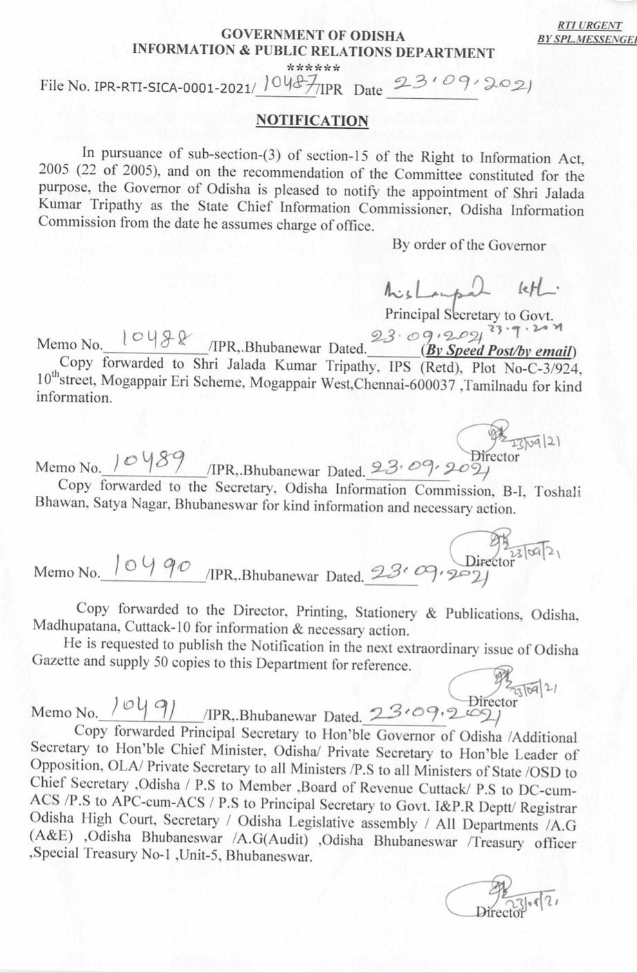 ଭୁବନେଶ୍ବର : ତାମିଲନାଡୁର ପୂର୍ବତନ ପୁଲିସ ଡିଜି ତଥା ଓଡିଆ ଆଇପିଏସ ଜଳଦ କୁମାର ତ୍ରିପାଠୀ ରାଜ୍ୟ ମୁଖ୍ୟ ସୂଚନା କମିସନର ହୋଇଛନ୍ତି। ରାଜ୍ୟପାଳ ପ୍ରଫେସର ଗଣେଶ ଲାଲ ତାଙ୍କୁ ନିଯୁକ୍ତି ଦେଇଛନ୍ତି। ଏହା ପୂର୍ବରୁ ମୁଖ୍ୟମନ୍ତ୍ରୀ ନବୀନ ପଟ୍ଟନାୟକଙ୍କ ଅଧ୍ୟକ୍ଷତାରେ ବସିଥିବା ଭର୍ଚୁଆଲ ବୈଠକରେ ଶ୍ରୀ ତ୍ରିପାଠୀଙ୍କ ନାମ ଚୂଡ଼ାନ୍ତ ହେବା ପରେ ରାଜ୍ୟପାଳଙ୍କ ଅନୁମୋଦନ ନିମନ୍ତେ ପଠାଯାଇଥିଲା। ରାଜ୍ୟପାଳଙ୍କ ଅନୁମୋଦନ ପରେ ସୂଚନା ଏବଂ ଲୋକସମ୍ପର୍କ ବିଭାଗ ପକ୍ଷରୁ ବିଧିବଦ୍ଧ ବିଜ୍ଞପ୍ତି ପ୍ରକାଶ ପାଇଛି । ରାଜଭବନରେ ରାଜ୍ୟପାଳ ତାଙ୍କୁ ପଦ ଓ ଗୋପନୀୟତାର ଶପଥ ପାଠ କରାଇବେ ବୋଲି ଜଣାପଡିଛି ।