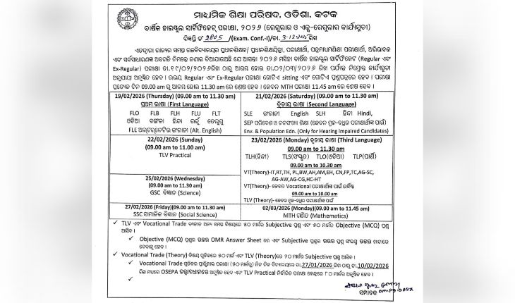 କଟକ: ଫେବ୍ରୁଆରୀ ୧୯ରୁ ମାଟ୍ରିକ ପରୀକ୍ଷା। ମାର୍ଚ୍ଚ ୨ ତାରିଖରେ ସରିବ ପରୀକ୍ଷା। ସକାଳ ୯ ଟାରୁ ଆରମ୍ଭ ହୋଇ ୧୧ ଟା ୩୦ ଯାଏ ଚାଲିବ ପରୀକ୍ଷା। ଗଣିତ ପାଇଁ ଅଧିକ ୧୫ ମିନିଟ ସମୟ ପ୍ରଦାନ କରାଯିବ। ମାତୃଭାଷା ୧୯ ତାରିଖରେ, ୨୧ରେ ଇଂରାଜୀ, ୨୩ରେ ସଂସ୍କୃତ ଓ ହିନ୍ଦୀ, ୨୫ରେ ବିଜ୍ଞାନ, ୨୭ରେ ସାମାଜିକ ବିଜ୍ଞାନ, ମାର୍ଚ୍ଚ ୨ ତାରିଖରେ ଗଣିତ ପରୀକ୍ଷ ଅନୁଷ୍ଠିତ ହେବ ବୋଲି ମାଧ୍ୟମିକ ଶିକ୍ଷା ପରିଷଦ ପକ୍ଷରୁ ସୂଚନା ପ୍ରଦାନ କରାଯାଇଛି।
