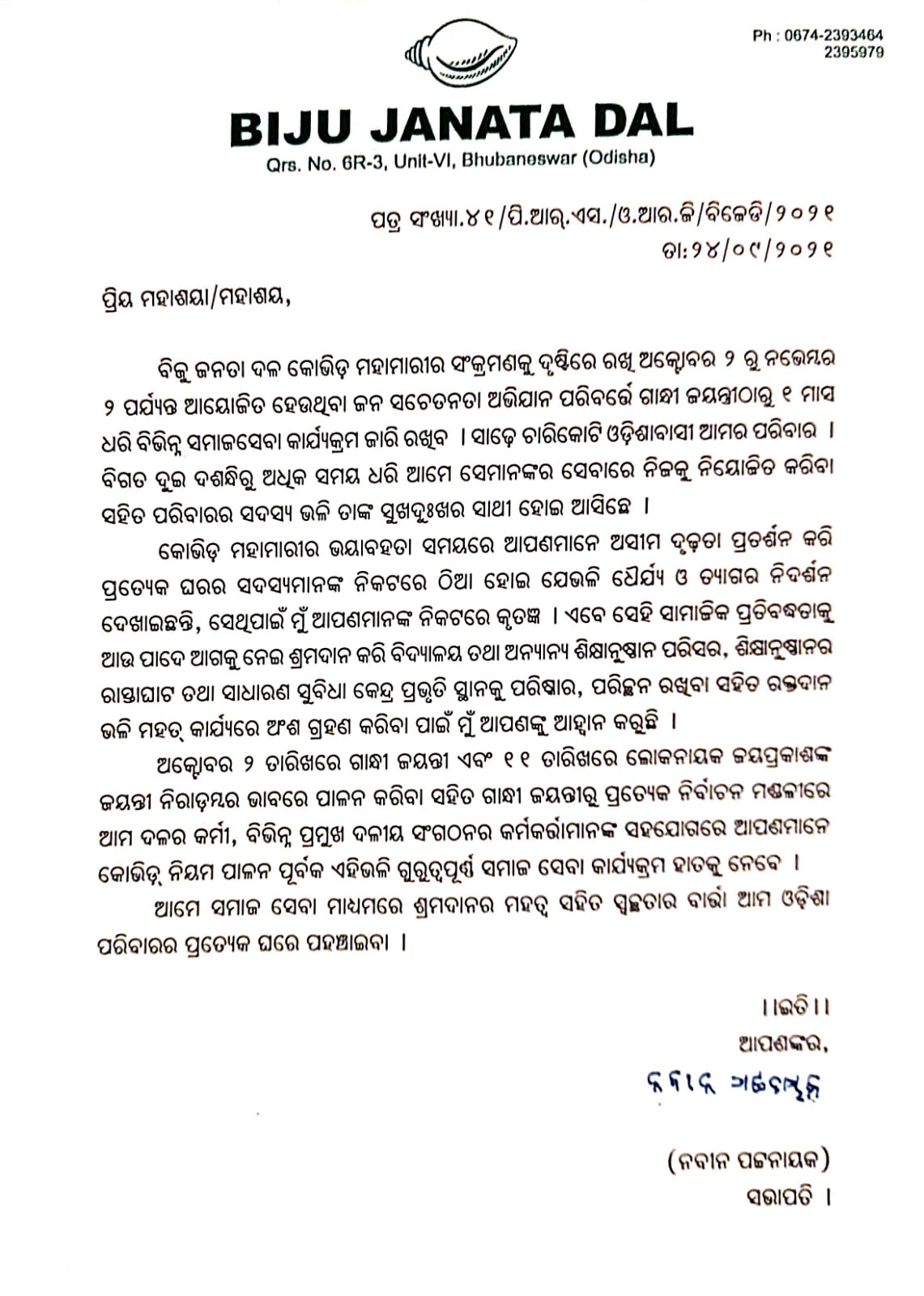 ଚିଠିରେ ମୁଖ୍ୟମନ୍ତ୍ରୀ ଉଲ୍ଲେଖ କରିଛନ୍ତି କୋଭିଡ୍ ମହାମାରୀ ସଂକ୍ରମଣକୁ ଦୃଷ୍ଟିରେ ରଖି ଦଳ ଚଳିତଥର ଅକ୍ଟୋବର ୨ରୁ ନଭେମ୍ବର ୨ତାରିଖ ପର୍ଯ୍ୟନ୍ତ ଆୟୋଜିତ ହେଉଥିବା ଜନ ସଚେତନତା ଅଭିଯାନ କରିବ ନାହିଁ। ତା’ ପରିବର୍ତ୍ତେ ବିଭିନ୍ନ ସମାଜସେବା କାର୍ଯ୍ୟକ୍ରମ ଜାରି ରଖିବ। ଗତ ଦୁଇ ଦଶନ୍ଧିରୁ ଅଧିକ ସମୟ ଧରି ସାଢ଼େ ୪କୋଟି ଓଡ଼ିଶାବାସୀଙ୍କ ସେବାରେ ନିୟୋଜିତ ରହି ପରିବାର ସଦସ୍ୟଙ୍କ ଭଳି ସେମାନଙ୍କ ସୁଖଦୁଃଖରେ ସାଥୀ ହୋଇଛେ । କୋଭିଡ୍ ମହାମାରୀର ଭୟାବହତା ସମୟରେ ଅସୀମ ଦୃଢ଼ତା ପ୍ରଦର୍ଶନ କରି ପ୍ରତ୍ୟେକ ଘରର ସଦସ୍ୟମାନଙ୍କ ନିକଟରେ ଠିଆ ହୋଇ ଯେଭଳି ଧୈର୍ଯ୍ୟ ଓ ତ୍ୟାଗର ନିଦର୍ଶନ ଦେଖାଇଛନ୍ତି ସେଥିପାଇଁ କୃତଜ୍ଞତା ଜଣାଉଛି।