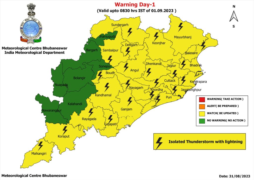 ଭୁବନେଶ୍ବର: ରାଜ୍ୟରେ ଆଗାମୀ ୨୪ ଘଣ୍ଟା ମଧ୍ୟରେ ଉପକୂଳ ସମେତ ପାର୍ଶ୍ବବର୍ତ୍ତୀ ଜିଲ୍ଲାଗୁଡିକରେ ବିଜୁଳି ଘଡ଼ଘଡ଼ି ସହ ବର୍ଷା ସମ୍ଭାବନା ରହିଛି। ଏ ନେଇ ୨୩ ଜିଲ୍ଲାକୁ ୟେଲୋ ୱାର୍ଣ୍ଣିଂ ଜାରି କରିଛି ପାଣିପାଗ ବିଭାଗ । ଉକ୍ତ ଜିଲ୍ଲାଗୁଡ଼ିକ ହେଉଛି ମାଲକାନାଗିରି, କୋରାପୁଟ, ରାୟଗଡ଼ା, ଗଜପତି, ଗଞ୍ଜାମ, ନୟାଗଡ଼, କନ୍ଧମାଳ, ବୌଦ୍ଧ, ଅନୁଗୁଳ, ସମ୍ବଲପୁର, ଦେବଗଡ଼, ସୁନ୍ଦରଗଡ଼, କେନ୍ଦୁଝର, ମୟୁରଭଞ୍ଜ, ଦେବଗଡ଼, ଢେଙ୍କାନଳ, ଯାଜପୁର, ବାଲେଶ୍ବର, ଭଦ୍ରକ, ପୁରୀ, ଖର୍ଦ୍ଧା, କେନ୍ଦ୍ରାପଡ଼ା ଓ ଜଗତସିଂହପୁର।
