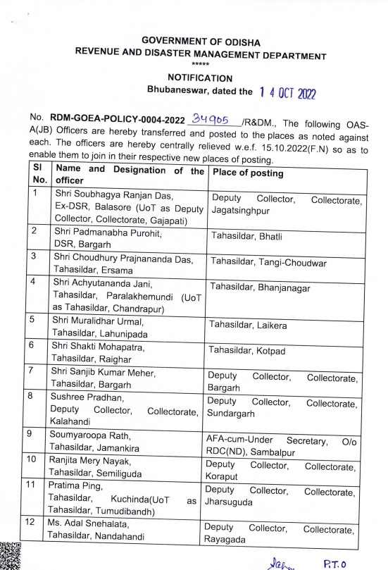 ସେହିପରି ପ୍ରତିମା ପିଙ୍ଗଙ୍କୁ କୁଚିଣ୍ଡା ତହସିଲଦାରରୁ ଡେପୁଟି କଲେକ୍ଟର ଝାରସୁଗୁଡାକୁ ବଦଳି , ଅଦଲ ସ୍ନେହଲତାଙ୍କୁ ନନ୍ଦାହାଣ୍ଡି ତହସିଲଦାରରୁ ଡେପୁଟି କଲେକ୍ଟର ରାୟଗଡାକୁ ବଦଳି ,ବସନ୍ତ କୁମାର ସାହଣୀଙ୍କୁ ତିହିଡି ବିଡିଓରୁ ସୋର ତହସିଲଦାର ଭାବରେ ନିଯୁକ୍ତି ଦିଆଯାଇଛି । ଅନ୍ୟପଟେ ମଧୁସୂଦନ ନାୟକଙ୍କୁ ଭଦ୍ରକ ତହସିଲଦାରରୁ କିସନନଗର ତହସିଲଦାର ଭାବେ ବଦଳି , ଦେବେନ୍ଦ୍ର କୁମାର ଶତପଥିଙ୍କୁ ବ୍ୟକ୍ତିଗତ ଅଧିକାରୀ ପାଠ୍ୟପୁସ୍ତକ ଉନ୍ମୋଚନ ରୁ ଆଡମିନଷ୍ଟ୍ରେଟିଭ ଅଫିସର, ଆରସିଏସକୁ ବଦଳି , କ୍ଷେତ୍ର ମୋହନ ସ୍ୱାଇଁଙ୍କୁ ଆଡମିନଷ୍ଟ୍ରେଟିଭ ଅଫିସର, ଆରସିଏସ ରୁ ଓଏସଡି ବିଭାଗକୁ ବଦଳି , ଶଙ୍କର ପ୍ରସାଦ ସାହୁଙ୍କୁ ବିଡିଓ କଙ୍କଡାହାଡରୁ ଡେପୁଟି କମିଶନର ଏସଏମସିକୁ ବଦଳି , ଯୋଗେନ୍ଦ୍ର ମାଝିଙ୍କୁ ଡେପୁଟି କଲେକ୍ଟର ଝାରସୁଗୁଡାରୁ ବ୍ୟକ୍ତିଗତ ଅଧିକାରୀ ପାଠ୍ୟପୁସ୍ତକ ଉନ୍ମୋଚନ ବିଭାଗକୁ ବଦଳି , ହୃଷିକେଶ ତ୍ରୀପାଠି ସବ-ରେଜିଷ୍ଟ୍ରର ଜଟଣୀ ରୁ ଡେପୁଟି କଲେକ୍ଟର ଭାବେ ବୈାଦ୍ଧକୁ ବଦଳି କରାଯାଇଛି । କାହ୍ନୁ ଚରଣ ଘଡାଇଙ୍କୁ ତହସିଲଦାର ବ୍ରହ୍ମଗିରିରୁ ରପ୍ତାନୀ ପ୍ରୋତ୍ସାହନ ଏବଂ ମାର୍କେଟିଂ , ଓଡିଶାକୁ ବଦଳି କରାଯାଇଛି ।