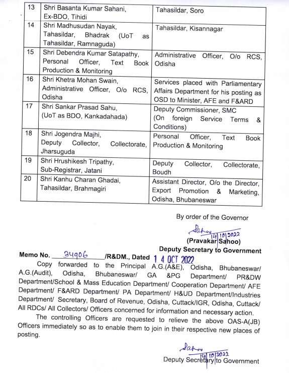 ଆଜି ବଦଳି କରାଯାଇଥିବା ୨୦ ଜଣ ଓଏଏସଙ୍କ ମଧ୍ୟରୁ ସୈାଭାଗ୍ୟ ରଞ୍ଜନ ଦାସଙ୍କୁ ଏକ୍ସ-ଡିଏସଆର ବାଲେଶ୍ୱରରୁ ଉପଜିଲ୍ଲାପାଳ ଜଗତସିଂହପୁରଙ୍କୁ ବଦଳି କରାଯାଇଛି । ସେହିପରି ପଦ୍ମନାଭ ପୁରୋହିତଙ୍କୁ ଡିଏସଆର ବରଗଡରୁ ତହସିଲଦାର ଭଟିଲ ଭାବେ ବଦଳି , ଚୈାଧୁରୀ ପ୍ରଜାନନ୍ଦ ଦାସ ତହସିଲଦାର ଏରସମା ରୁ ଟାଙ୍ଗି-ଚୈାଦ୍ୱାରର ତହସିଲଦାର ଭାବେ ବଦଳି କରାଯାଇଛି । ଅଚ୍ୟୁତାନନ୍ଦ ଜାନିଙ୍କୁ ପାରଳାଖେମୁଣ୍ଡି ତହସିଲଦାରରୁ ଭଂଜନଗର ତହସିଲଦାର ଭାବେ ବଦଳି, ମୁରଲୀଧର ଉର୍ମାଲଙ୍କୁ ଲହୁଣିପଡା ତହସିଲଦାରରୁ ଲାଇକେରା ତହସିଲଦାର ଭାବେ ନିଯୁକ୍ତି କରାଯାଇଛି । ଶକ୍ତି ମହାପାତ୍ରଙ୍କୁ ରାଇଘର ତହସିଲଦାରରୁ କୋଟପାଡ ତହସିଲଦାର ଭାବେ ବଦଳି , ସଂଜୀବ କୁମାର ମେହେରଙ୍କୁ ବରଗଡ ତହସିଲଦାରରୁ ଡେପୁଟି କଲେକ୍ଟର ବରଗଡକୁ ବଦଳି , ଶୁଶ୍ରୀ ପ୍ରଧାନଙ୍କୁ ଡେପୁଟି କଲେକ୍ଟର କଳାହାଣ୍ଡିରୁ ଡେପୁଟି କଲେକ୍ଟର ସୁନ୍ଦରଗଡକୁ ବଦଳି , ସୈାମ୍ୟରୂପା ରଥଙ୍କୁ ଜମନକିରା ତହସିଲଦାରରୁ ଆରଡିସି ସମ୍ବଲପୁରକୁ ବଦଳି , ରଂଜିତାମେରୀ ନାୟକଙ୍କୁ ସେମିଳିଗୁଡା ତହସିଲଦାରରୁ ଡେପୁଟି କଲେକ୍ଟର କୋରାପୁଟକୁ ବଦଳି କରାଯାଇଛି ।
