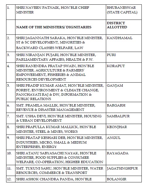 ମୁଖ୍ୟମନ୍ତ୍ରୀ ଭୁବନେଶ୍ବରରେ ପତାକା ଉତ୍ତୋଳନ କରିବାକୁ ଥିବା ବେଳେ କନ୍ଧମାଳରେ ଅନୁସୂଚିତ ଜାତି ଓ ଜନଜାତି ବିକାଶ ମନ୍ତ୍ରୀ ଜଗନ୍ନାଥ ସାରକା, ପୁରୀରେ ସ୍ବାସ୍ଥ୍ୟମନ୍ତ୍ରୀ ନିରଞ୍ଜନ ପୂଜାରୀ, କୋରାପୁଟରେ କୃଷିମନ୍ତ୍ରୀ ରଣେନ୍ଦ୍ର ପ୍ରତାପ ସ୍ୱାଇଁ,ଗଞ୍ଜାମରେ ଜଙ୍ଗଲ, ପରିବେଶ ଓ ପଞ୍ଚାୟତିରାଜ ଓ ସୂଚନା ପ୍ରସାରଣ ମନ୍ତ୍ରୀ ପ୍ରଦୀପ କୁମାର ଅମାତ, ବରଗଡରେ ରାଜସ୍ୱ ମନ୍ତ୍ରୀ ପ୍ରମିଳା ମଲ୍ଲିକ, ସମ୍ବଲପୁରରେ ଗୃହ ଏବଂ ସହରୀ ବିକାଶମନ୍ତ୍ରୀ ଉଷା ଦେବୀ,କେନ୍ଦୁଝରରେ ଇସ୍ପାତ ଏବଂ ଖଣିମନ୍ତ୍ରୀ ପ୍ରଫୁଲ୍ଲ କୁମାର ମଲ୍ଲିକ,ଅନୁଗୁଳରେ ଶିଳ୍ପମନ୍ତ୍ରୀ ପ୍ରତାପ କେଶରୀ ଦେବ,ରାୟଗଡାରେ ଖାଦ୍ୟ ଯୋଗାଣ ମନ୍ତ୍ରୀ ଅତନୁ ସବ୍ୟସାଚୀ ନାୟକ, ସୁନ୍ଦରଗଡରେ ଯୋଜନା ମନ୍ତ୍ରୀ ରାଜେନ୍ଦ୍ର ଢୋଲକିଆ, ଜଗତସିଂହପୁରରେ ଜଳ ସମ୍ପଦ ଓ ପରିବହନ ମନ୍ତ୍ରୀ ଟୁକୁନି ସାହୁ, ବଲାଙ୍ଗୀରରେ ବିଜ୍ଞାନ ଏବଂ ପ୍ରଯ୍ୟୁକ୍ତି ମନ୍ତ୍ରୀ ଅଶୋକ କୁମାର ପଣ୍ଡା, କଟକରେ ଅର୍ଥମନ୍ତ୍ରୀ ବିକ୍ରମ କେଶରୀ ଆରୁଖ, ବାଲେଶ୍ୱରରେ ସ୍କୁଲ ଓ ଗଣଶିକ୍ଷାମନ୍ତ୍ରୀ ସୁଦାମ ମାରାଣ୍ଡି,ମୟୁରଭଞ୍ଜରେ ପର୍ୟ୍ୟଟନ ମନ୍ତ୍ରୀ ଅଶ୍ୱନୀ କୁମାର ପାତ୍ର । କଳାହାଣ୍ଡିରେ ଗ୍ରାମାଞ୍ଚଳ ବିକାଶ ମନ୍ତ୍ରୀ ପ୍ରୀତିରଂଜନ ଘଡେଇ, ମାଲକାନାଗିରିରେ କ୍ରୀଡାମନ୍ତ୍ରୀ ତୁଷାରକାନ୍ତି ବେହେରା ,ସୋନପୁରେ ହସ୍ତଶିଳ୍ପ ମନ୍ତ୍ରୀ ରୀତା ସାହୁ, ଢେଙ୍କାନାଳରେ ମହିଳା ଓ ମିଶନ ଶକ୍ତି ମନ୍ତ୍ରୀ ବାସନ୍ତୀ ହେମ୍ବ୍ରମ୍ ପତାକା ଉତ୍ତୋଳନ କରିବେ।