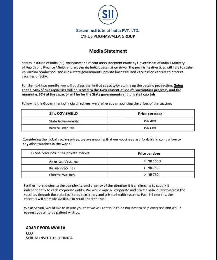 ଖୋଲା ବଜାରରେ ମିଳିବ ଟିକା: ସରକାରୀ ହସ୍ପିଟାଲ ପାଇଁ ୪୦୦, ଘରୋଇ ହସ୍ପିଟାଲ ପାଇଁ ୬୦୦ ଟଙ୍କା