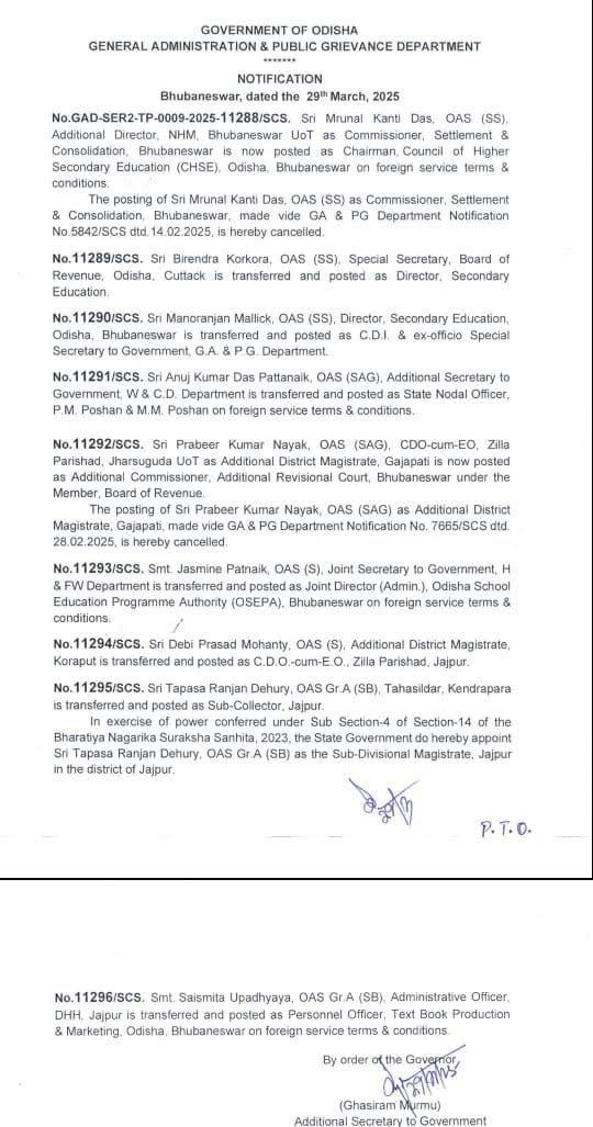 ସେହିପରି ଝାରସୁଗୁଡ଼ା ଜିଲ୍ଲା ପରିଷଦ ନିର୍ବାହୀ ଅଧିକାରୀ ପ୍ରବୀର କୁମାର ନାୟକ ଭୁବନେଶ୍ୱର ଅତିରିକ୍ତ ରିଭିଜିନାଲ କୋର୍ଟରେ ଅତିରକ୍ତ କମିଶନର, ସ୍ୱାସ୍ଥ୍ୟ ବିଭାଗ ଯୁଗ୍ମ ସଚିବ ଜାସ୍ମିନ୍ ପଟ୍ଟନାୟକ ଓସେପା ଯୁଗ୍ମ ନିର୍ଦ୍ଦେଶକ, କୋରାପୁଟ ଅତିରିକ୍ତ ଜିଲ୍ଲାପାଳ ଦେବୀ ପ୍ରସାଦ ମହାନ୍ତି ଯାଜପୁର ଜିଲ୍ଲା ପରିଷଦ ନିର୍ବାହୀ ଅଧିକାରୀ, କେନ୍ଦ୍ରାପଡ଼ା ତହସିଲଦାର ତାପସ ରଞ୍ଜନ ଦେହୁରୀ ଯାଜପୁର ଉପ ଜିଲ୍ଲାପାଳ ଏବଂ ଯାଜପୁର ମେଡିକାଲର ପ୍ରଶାସନିକ ଅଧିକାରୀ ସାଇସ୍ମିତା ଉପାଧ୍ୟାୟ ପୁସ୍ତକ ପ୍ରକାଶନରେ କାର୍ମିିକ ଅଧିତକାରୀ ଭାବେ ବଦଳି ହୋଇଛନ୍ତି।