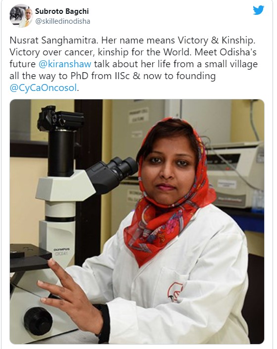 ସୋର: କର୍କଟ ରୋଗର ଉପସମ, କମ ଔଷଧ ବ୍ୟବହାର, ଔଷଧ ସେବନ ପରେ ପାର୍ଶ୍ବ ପ୍ରତିକ୍ରିୟା କମ ଉପରେ ଗବେଷଣା କରୁଥିବା ଗବେଷିକା ଓଡ଼ିଶାର ବାଲେଶ୍ୱର ସୋରର ଝିଅ ନୁସରତ ସଂଘମିତ୍ରାଙ୍କୁ ବିଶିଷ୍ଟ ଉଦ୍ୟୋଗପତି ତଥା ଓଡ଼ିଶା ଦକ୍ଷତା ବିକାଶ ପ୍ରାଧିକରଣର ଅଧ୍ୟକ୍ଷ ଡ. ସୁବ୍ରତ ବାଗଚି ଏକ ସାକ୍ଷାତକାର କରିବା ପରେ ଟ୍ୱିଟ କରି ଉଚ୍ଚ ପ୍ରଶଂସା କରିଛନ୍ତି। ଏହା ପରେ ବାଲେଶ୍ୱର ଜିଲାପାଳ ମଧ୍ୟ ଟ୍ୱିଟ କରି ଶୁଭେଛା ଜଣାଇଛନ୍ତି। ସୋର ପୌରପାଳିକା ମୋବାରକପୁର ଗ୍ରାମର ସେକ ରହେମତୁଲ୍ଲାଙ୍କ ଝିଅ ନୁସରତ ସଂଘମିତ୍ରା ଛାତ୍ର ଜୀବନରେ ରସାୟନ ବିଜ୍ଞାନରେ ବେଙ୍ଗଲୋର ଇଣ୍ଡିଆନ ଇନଷ୍ଟିୁଚ୍ୟୁଟ ଅଫ ସାଇନ୍ସରେରେ ଗବେଷଣା କରିବା ପରେ ନେଦରଲ୍ୟାଣ୍ଡ କ୍ୱୋଟୋ ବିଶ୍ୱବିଦ୍ୟାଳୟ ଓ ଜାପାନରେ ପୋଷ୍ଟ ଡକ୍ଟରେଟ କରିଥିଲେ। ସେ ପାଠ ପଢ଼ିବା ସମୟରେ ବାପା ରହେମତୁଲ୍ଲା କର୍କଟ ରୋଗରେ ପଡ଼ି କଷ୍ଟ ପାଇବା ପରେ ନୁସରତ କର୍କଟ ଉପରେ ଗବେଷଣା ଆରମ୍ଭ କରିଥିଲେ।