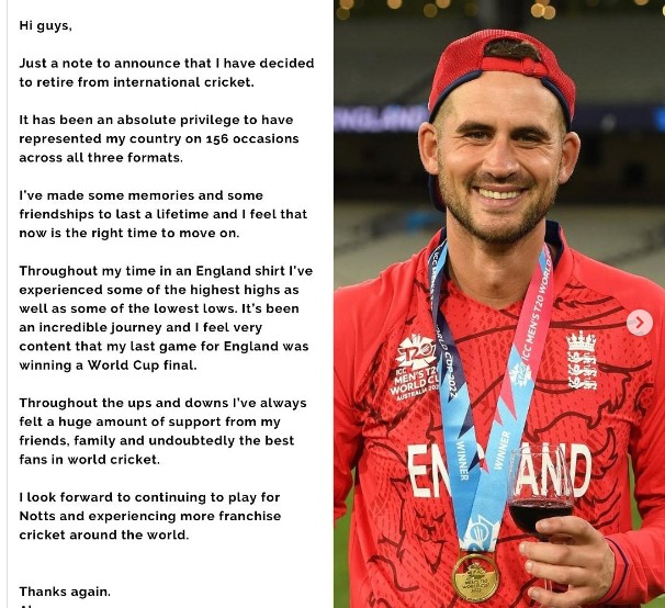 ଇନଷ୍ଟାଗ୍ରାମ ପୋଷ୍ଟରେ ଇଂଲଣ୍ଡ ଦଳର ଏହି ଷ୍ଟାର ଖେଳାଳି ଅନ୍ତର୍ଜାତୀୟ କ୍ରିକେଟରୁ ଅବସର ଘୋଷଣା କରିଛନ୍ତି।ଆଲେକ୍ସ ହେଲ୍ସ ଲେଖିଛନ୍ତି ମୁଁ ଅନ୍ତର୍ଜାତୀୟ କ୍ରିକେଟରୁ ସନ୍ନ୍ୟାସ ନେବାକୁ ନିଷ୍ପତ୍ତି ନେଇଛି । ତିନୋଟି ଫର୍ମାଟକୁ ମିଶାଇ ଦେଶ ପାଇଁ ୧୫୬ଟି ମ୍ୟାଚରେ ପ୍ରତିନିଧିତ୍ୱ କରିବା ମୋର ସୌଭାଗ୍ୟ ଅଟେ । ସାରା ଜୀବନ ପାଇଁ ମୁଁ କିଛି ସ୍ମୃତି ବନେଇଛି , ଯାହାକି ମୋତେ ଆଗକୁ ବଢିବାକୁ ସାହାଯ୍ୟ କରିବ ।