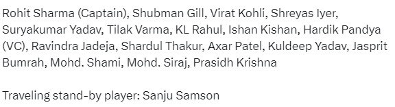 ରୋହିତ ଶର୍ମା (ଅଧିନାୟକ), ଶୁଭମନ ଗିଲ, ବିରାଟ କୋହଲି, ଶ୍ରେୟାଶ ଆୟାର,ସୂର୍ଯ୍ୟକୁମାର ଯାଦବ, ତିଲକ ବର୍ମା, କେଏଲ ରାହୁଲ, ଈଶାନ କିଶାନ, ହାର୍ଦ୍ଦିକ ପାଣ୍ଡ୍ୟା (ଉପ ଅଧିନାୟକ), ରବୀନ୍ଦ୍ର ଜାଡେଜା, ଶାର୍ଦ୍ଦୁଳ ଠାକୁର, ଅକ୍ଷର ପଟେଲ, କୂଲଦୀପ ଯାଦବ, ଯଶପ୍ରୀତ ବୁମରାହ, ମହମ୍ମଦ ସାମି, ମହମ୍ମଦ ସିରାଜ ଓ ପ୍ରସିଦ୍ଧ କ୍ରିଷ୍ଣା । ଏଥିସହ ଷ୍ଟାଣ୍ଡ ବାଏରେ ସଞ୍ଜୁ ସାମସନ ରହିଛନ୍ତି।